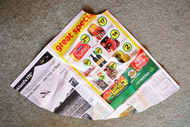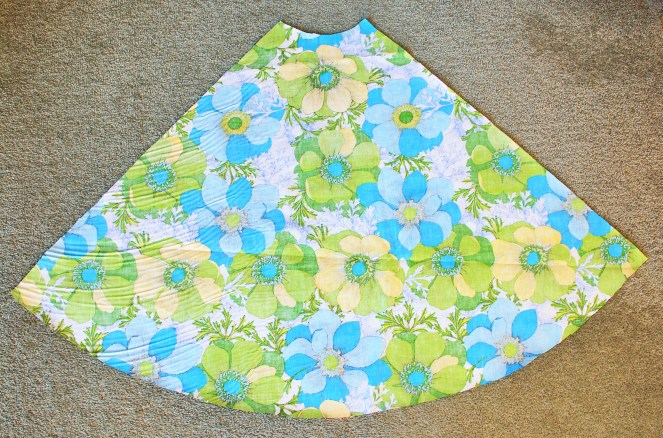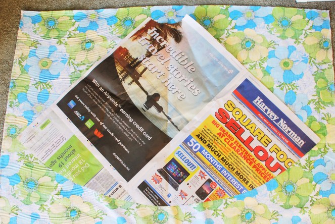 1. First you’ll need to make a pattern. I find that making quarter of a circle is best, and I made mine out of newspaper. Take your waist measurement, divide this by pi (3.14), and then divide that number by two – this is your waist radius. For example, my waist is 25 inches, so (25 / 3.14 / 2) my waist radius is 3.98 inches. I use this to make the small curve at the top of the picture, which you can do by keeping the base your tape measure at the corner of the newspaper and moving it round, marking out the waist radius measurement as you go. Then join these markings together to make a curve. You can then cut this out. Then decide how long you want the skirt to be – I make mine to be about 25 inches – and measure that plus an inch for hemming around the waist radius, again moving the tape measure to make a curve. Once you’ve cut this part, you should have something similar to the cut-out below.