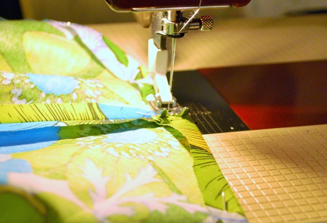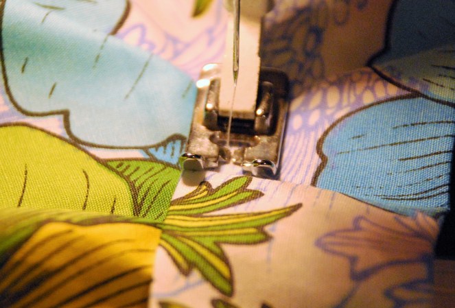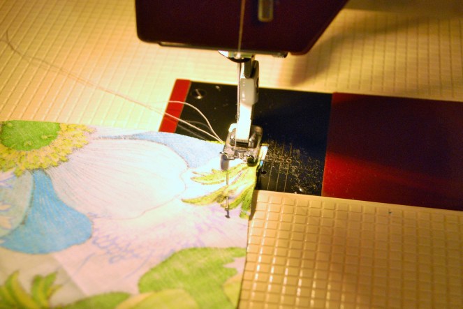 6. Use a sewing machine to sew each of the quarters together. Make sure you sew with the fabric showing inside out! I try to have the stiching about quarter of an inch in from the edge of the fabric as shown.