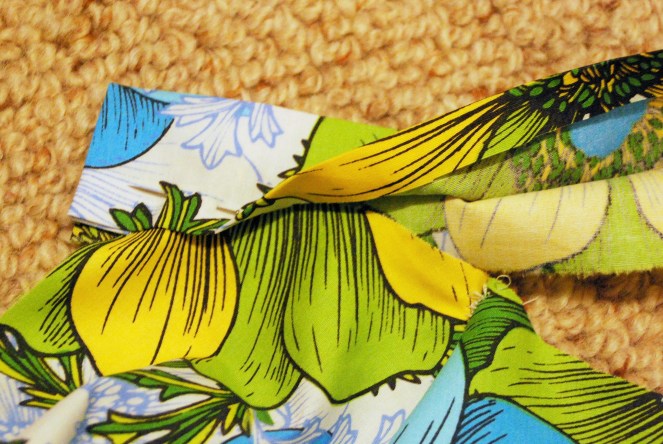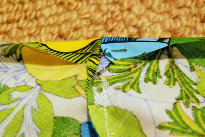 11. Pin the waistband around the top of the skirt. Do this by folding in each end (so threads aren’t showing), then making sure the main skirt fabric goes right up into the waistband and that the folded over side of the waistband (the one we ironed earlier) is on the outside. Also ensure that each side of the skirt opening is folded in (second picture). The ends of the waistband will overlap themselves when you wear the skirt, so try to make one end a bit longer than the other as pictured.