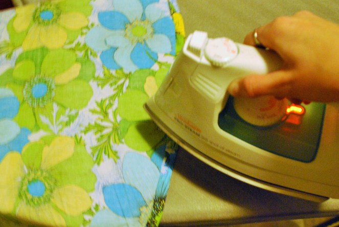 8. Iron your pinned hem so that it’s easier to side. Also, take the waistband we pinned earlier and iron that too. Then take the pins out, fold in half, and iron.