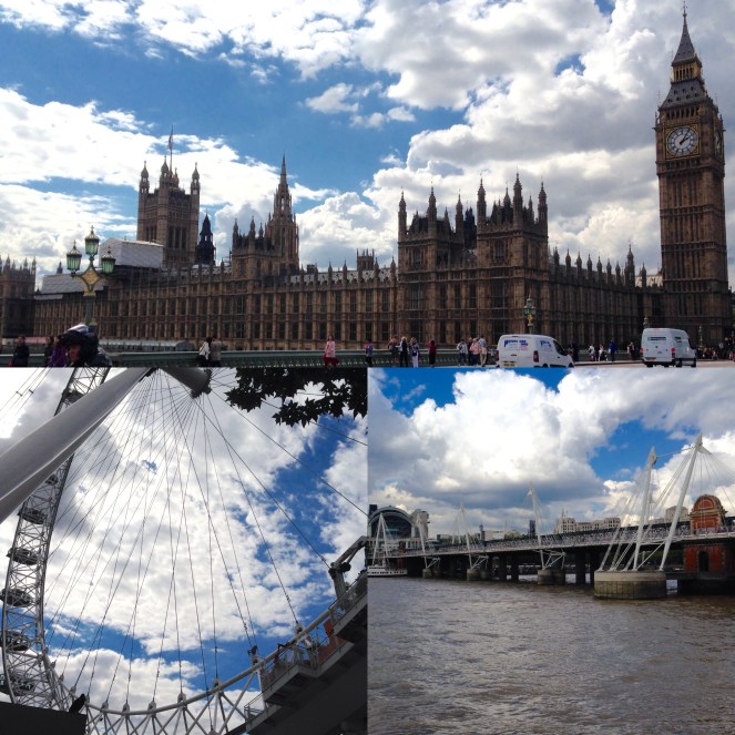 Big Ben and the houses of Parliament; Hungerford and Golden Jubilee bridges; the London Eye