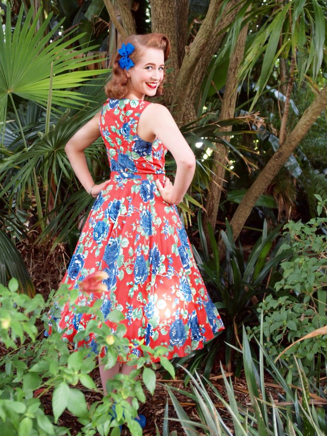 This colourway of the Audrey dress is made up of royal blue roses with mint green leaves and flecks of white on a striking red-orange background. I initially struggled in choosing which accessories to pair it with (white would have worked of course, but that’s far too easy!) and ended up going with the royal blue to highlight the florals. I also think these are colours that could easily be complemented by another colour entirely – next time I might try mine with yellow!