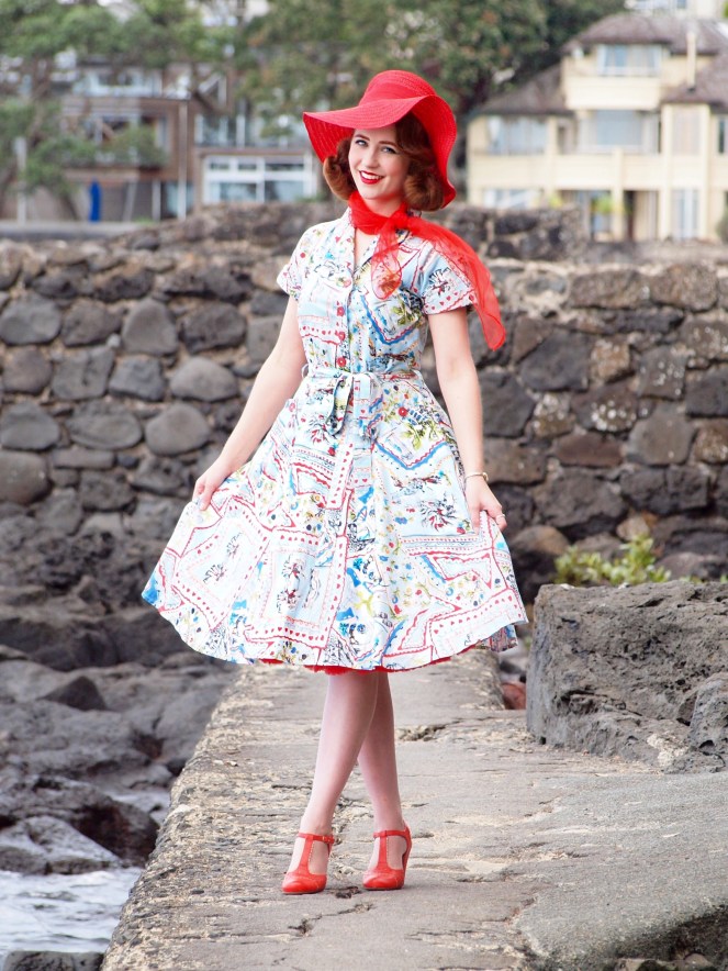 The Postcard dress features a sweet collar and short sleeves, red buttons up the front, and a matching belt. The belt is self-tie so will fit any waist size, and it can thread through the sewn-in belt loops. There is also a side zip to making getting in and out just a little easier. The dress is made of and lined with a lightweight cotton, and the lining even has a few inches of red tulle at the bottom to give a petticoat effect. The A-line skirt falls just below my knees and has enough sweep to take a 2-layer petticoat (if you’re like me and live the poofy life). And then there are pockets! These even button up with red buttons that match those down the front. Too cute!