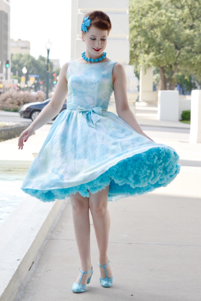 The Lulu Tea dress is very well constructed and features a round modest neckline and slight V-neck back with an invisible zip, a tie at the waist and a pleated, full-flared skirt. The fabric is light and floaty (perfect for summer!) and the dress is fully lined with satin. The skirt goes to just below my knees and my petticoat shortened to 22″ sits just underneath the hemline. Originally I thought the print was clouds but it’s actually a very lovely yet subtle seashell print, featuring pale blue, turquoise, mint and white, and for this shoot I chose to bring out the turquoise with slightly darker accessories.