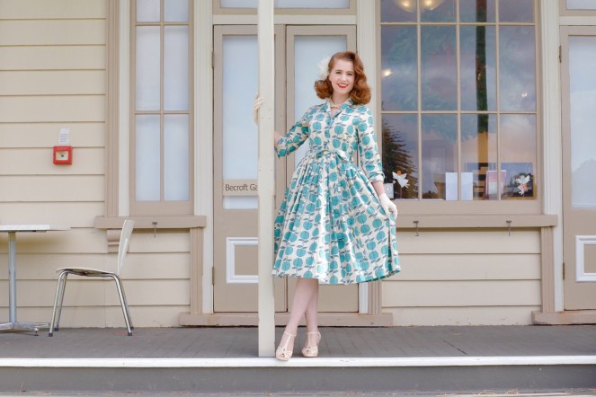 The blue apple dress is designed in a shirt style which buttons up the front with sweet blue buttons, and it also has a zip at the side to make it even easier to get in and out of. It features a lovely little collar, pockets (!), and fold-over sleeves that also button together. The apple dress also has matching tie belt which cinches in your waist and is long enough to tie in a nice big bow. The apple print itself is so adorable and is a gorgeous turquoise colour on a cream background, which actually looks and feels very vintage. I am such a sucker for a good novelty print and even more so if it’s got fruit in it, so this dress really ticks all the boxes!
