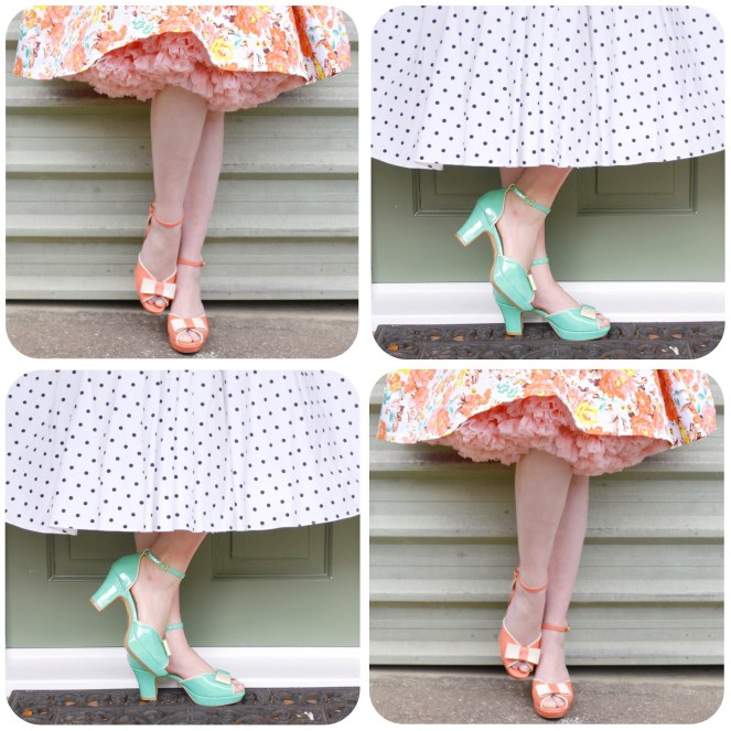 I could have ordered any of the Betty heel colours but settled on the Seafoam and Peach shades. The Seafoam is a bit more green than I had hoped and the Peach slightly more orange, but I know I will still have a large number of things to wear them with and most importantly they are different shades to anything else in my shoe cupboard. Both are vegan-friendly patent styles and so have felt a little hard on first wear (as opposed to the smooth faux leather of the Lorraine heel which is a lot softer), but there have been no blisters and they have generally still been quite comfy. The Betty heels come in a host of lovely colours such as lavender, vintage rose, and royal teal.
