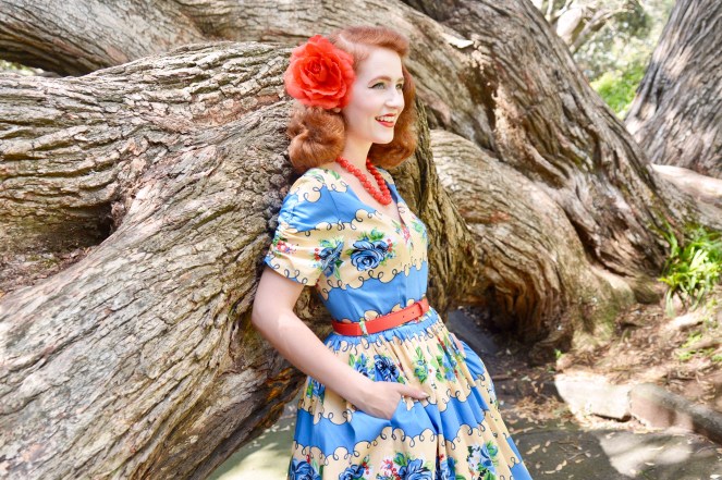 The Francine dress immediately caught my attention, mainly because of the fabric as I find the combination of the floral and stripe effect to be very reminiscent of true vintage dresses. This is seriously one of the most beautiful prints I’ve seen on a vintage reproduction dress; the blue roses are so delightful, and they’re interspersed with smaller red and white flowers on a buttery cream and azure blue background. And being almost 100% cotton you know that it’ll be a great choice for summer!