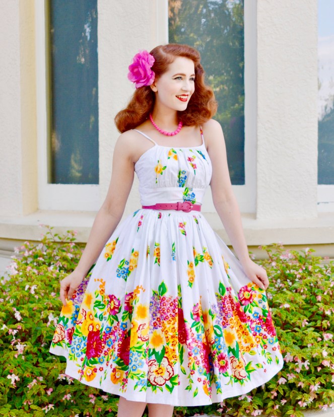 I chose to get the Grace dress made up in the ‘Russian White’ floral print fabric, which is a cotton poplin with a glorious border print of brightly coloured flowers. The blues, pinks and yellows of the print give you lots of summery accessorising options, and the border print gives major vintage vibes. Unfortunately the white colourway of this fabric is no longer available but you can still find the ‘Russian Red’ version here. I also have the Grace dress in yellow gingham which is equally as adorable and fun!