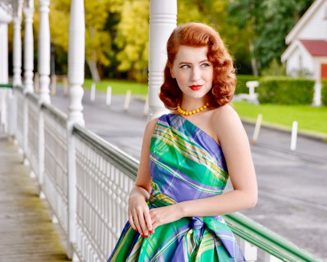 This Mr Mort dress is made of bright rayon taffeta, which gives it a really crisp and swishy feel. It’s a one-shoulder dress which I feel was more unusual for the time, and has an inbuilt petticoat to give volume to the full pleated skirt and matching tie belt. From the label I’ve been able to date this dress to the early 1960s, which seemed to be Mr Mort’s heyday. It also features one of my favourite things: pockets! It’s a rare treat to find them in a vintage dress, especially more of an evening style like this one.