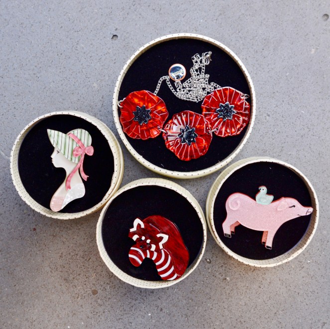 After doing some research I have found that the Polyanna brooch is one of the earlier Erstwilder designs, so it’s great to see her back for a new audience. She first wore a black hat and purple ribbon, but has now changed to a chic pale mint green and peachy pink combo. The mixture of patterned, textured and solid resins, along with Polyanna’s sweet face, really make this brooch something special.