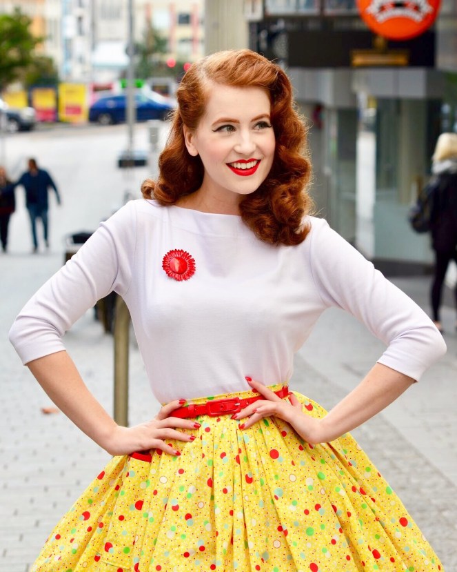 Miss Fortune was started by Laura in 2005 with a goal of making flattering vintage-inspired clothing, and has continued to flourish since then! I was so flattered that Laura came to me on this skirt, as she knew of my longtime love for yellow! The background of the 100% cotton 30s-inspired fabric is a bright and zesty shade, and it’s covered in red, green, pale blue and white dots of varying sizes. The Neat-O skirt has adorable details, from fastening at the back with a bright red button to the large patch pocket piped with red fabric to match. The skirt is super gathered at the waist, so you can expect a huge amount of volume! And if yellow’s not your thing then the Neat-O skirts also come in Cherry and Mint colourways, any of which is a delightful addition to your summer wardrobe.