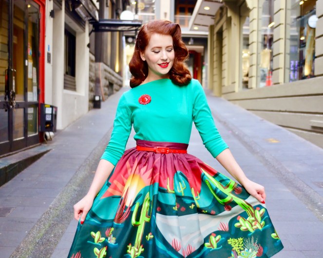 The Oblong Box Shop to me is synonymous with the best novelty prints! Owner and designer Denialle Von Fitch dreams up the most delightful creations that really capture the imagination and make you feel like you’re a walking piece of art. Today I am so lucky to get to style one of her latest pieces – the Cactus Dreams skirt!