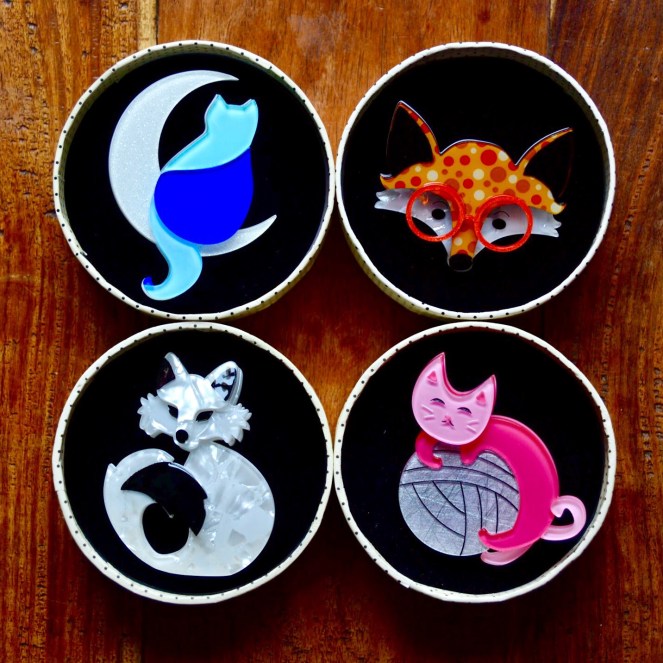 For the ultimate classic piece, look no further than the She’s So Foxy brooch. Rendered in textured resin, this foxy lady has a glamorous look and a big swishy tail. I have found myself more recently leaning towards simpler brooches, and the black & white colour palette is perfect minimalist chic to contrast against a bright top or cardigan. She must be popular as there have been a lot of other She’s So Foxy colourways in the past – I wonder if anyone’s collected them all?