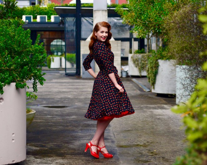 Though it’s hard to pick a favourite Karina Dresses dress (they are all so wonderful), the Ruby dress is definitely up there! With its faux-wrap style and waist tie it’s very flattering for all body types. Like all Karina styles the practical elements are so welcome too, like the non-crease microfibre fabric and the 3/4 sleeves to keep the chill off your arms. And of course, that print – wowza! As soon as I saw the fabric swatch for this dress I knew I needed it in my life. Those sweet little red tulips scattered across an inky black background make for a showstopper of a dress. If you can’t get enough of this striking and elegant print you’ll be pleased to know that it’s also been made into the short sleeved Margaret dress!