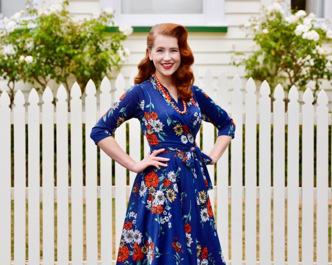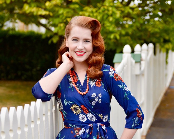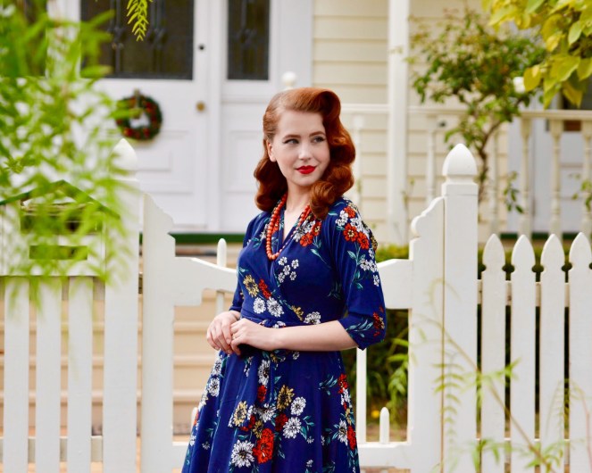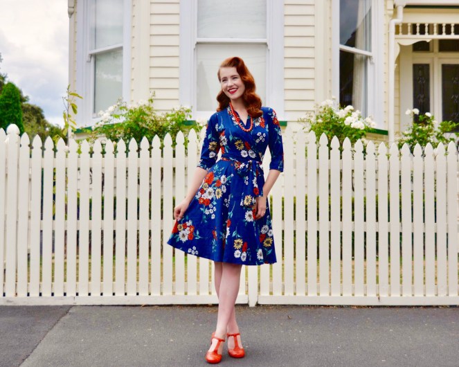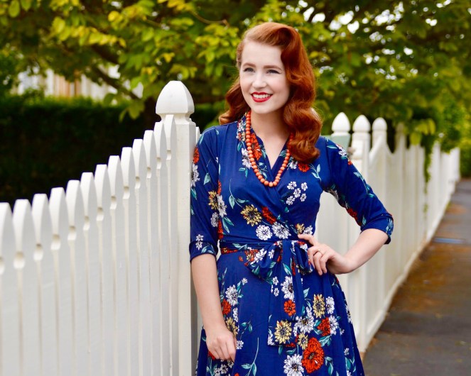 I can’t rave enough about the Ruby dress – it’s just so wonderful! It features 3/4 sleeves which keep the chill off as winter moves into spring, and the faux wrap style with waist tie is perfect for enhancing your curves. The magic meadows print itself is delightful, with a mixture of orange, yellow, and white flowers scattered over a navy blue background. I have already thrown this dress on so many times to go out in over the last month, as it’s such an easy way to feel instantly fabulous!