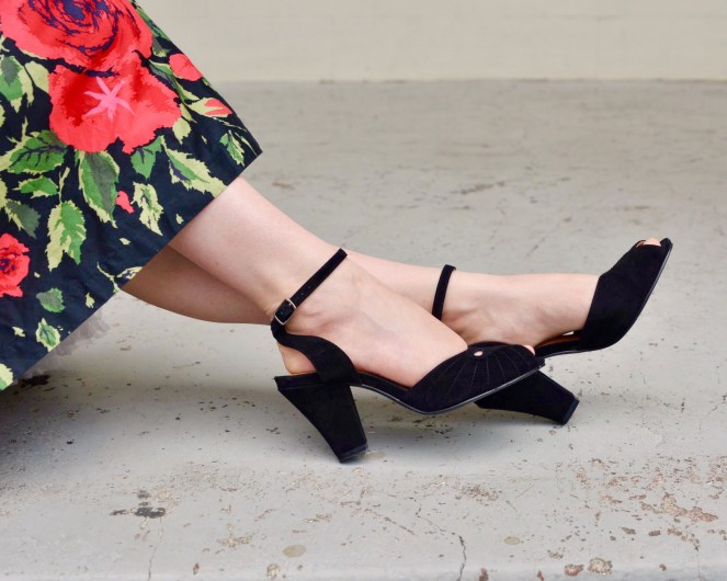 They are an exquisite 1940s style strappy heel, based on an original vintage shoe pattern. Even the heel itself is moulded directly after a true 40s shoe heel, and at 3” in height with a wide base it’s a great height without being too high. The black suede exterior is luscious and makes for a heel that can easily go from day to night. And the strappy D’Orsay style, fastening with an adjustable ankle strap, is so flattering; I don’t think my feet have ever looked so elegant!