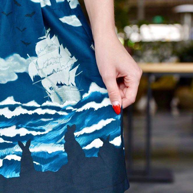 One of Dangerfield’s new arrivals that is a perfect match for these Erstwilder pieces is the Bunnies and Ghostship dress, that I chose to pair with the La Concorde brooch. I love how different this 100% cotton print is, with its border of bunnies watching those spooky ghost ships coming towards them. I’m wearing a size AU6 and it fits me dreamily. And it has pockets!