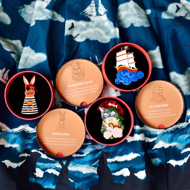 What happens when two amazing brands get together? Magic, of course! Erstwilder and Dangerfield have reunited (and it feels so good) after the success of their range of socks to bring you a piratical adventure – in brooch form! The Treasure Island collection includes seven brooches (one for each of the seven seas, perhaps?) based on original Dangerfield fashion illustrations rendered in resin. Note this collection can be purchased online via Erstwilder or Dangerfield, as well as in person at Dangerfield stores. Read on to find out my faves and see how I’ve styled them below!