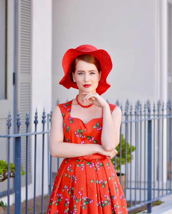 Let me start off by saying I am so impressed with the quality of this dress! All Maiocchi clothing is designed and made in Australia, and there’s clearly been a lot of love put into the design and construction of it. The bodice (with the sweetest sweetheart neckline) is fully lined, and the skirt is pleated front and back (but not the sides) to give the most flattering silhouette. Made from stretchy cotton, the Cherry Belle dress can easily mould to your curves and it’s super comfy. And that print is just stunning! It features classic cherries in pink and green on a bright red background, a print exclusive to Maiocchi.