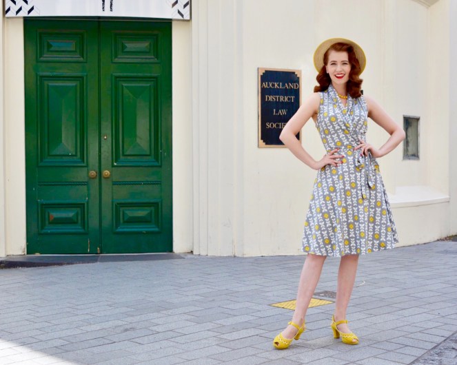 As soon as I saw there was a print with yellow in it this season, I had to have it! The lovey dovey print features the sweetest yellow flowers with white stems and leaves atop a grey background. I was worried that the grey might wash me out, but it’s an uplifting warm shade of grey which means the floral print is the focus of the design. The Ruby dress is my favourite Karina Dresses style, with that faux-wrap front and waist tie that makes it universally flattering.