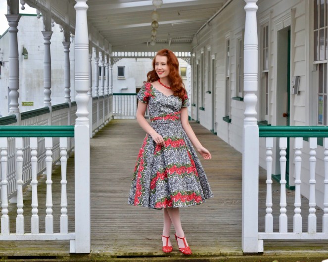 As soon as I saw this dress, I couldn’t wait to try it on! The painterly rose print is so lush, with the dark red blooms popping on the swirling grey background, and the print placement is excellent. This 100% cotton gem is fully lined, and comes with a matching reversible belt and pockets! The bodice is fitted with a V-neck and cap sleeves, flowing out into a swishy full circle skirt. This dress might be more of a summery style, where you could style it with a huge straw hat and chiffon scarf, but I’ve shown it can also be easily ‘winter-fied’ by adding a big red coat to keep warm!