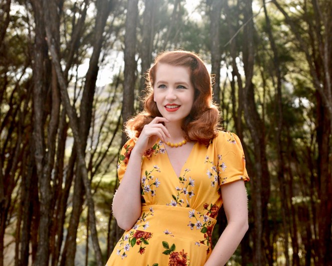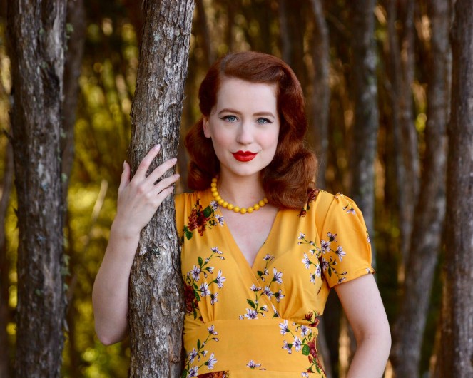 Set on a backdrop of the most gorgeous golden yellow, the golden days print features sprays of rust and white flowers (perhaps daisies) with olive green foliage. It’s hard to find yellow dresses, especially in such a luscious shade, so I’m smitten with this one! I’ve paired it with a matching necklace and heels but also added a contrasting cardigan for a really autumnal feel.