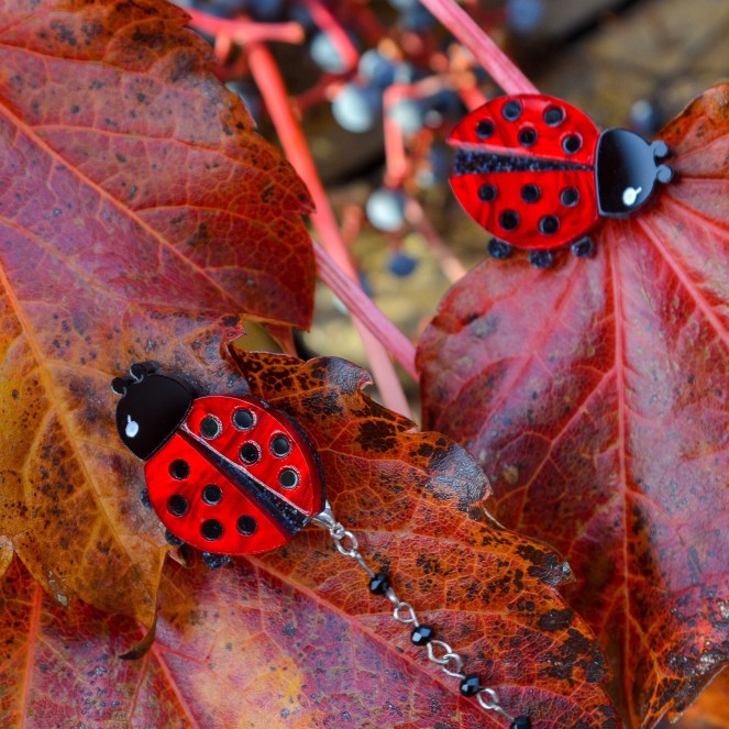 Ladybugs are so loveable, and Bonita has designed some super cute ones for Teacup Girl! These delightful little critters can be purchased facing either left or right, or get both for the perfect cardigan clips. Each bug measures 3.5cm x 2.8cm, and although they are small they are so eye-catching. Made from resplendent and shiny red and black acrylic with a glittery body and feet, they’ll go with so many things and are especially handy if you favour a lot of red and black in your winter colour palette like me!