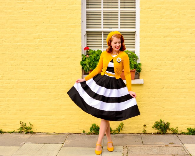 To me a classic black and white dress is a great piece to take you through from winter into spring and beyond, as you can pair it with darker colours and a coat in cooler temperatures and then start adding pops of colour as the months go along. Even though we shot this series on an absolutely freezing day (3 degrees I think!), I couldn’t go past my favourite all yellow accessories to give this look a summery feel, but it’s so versatile that it will go with literally all colours. The style itself is a simple stretch cotton sleeveless fit and flare, so easy to add a cardigan to while you still need layers and with a skirt so full you don’t even need a petticoat to fill it out. I would usually wear a size UK6, but in the Aurora dress I’m rocking a UK8 as that’s the lowest size Dolly & Dotty go down to. Once I cinched it a little with a belt it was a really great fit, and the skirt hits right on the knee for me. Currently you can nab this dress for £18/$24USD, such a bargain!