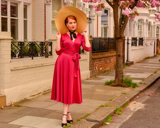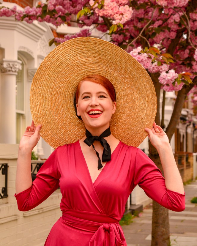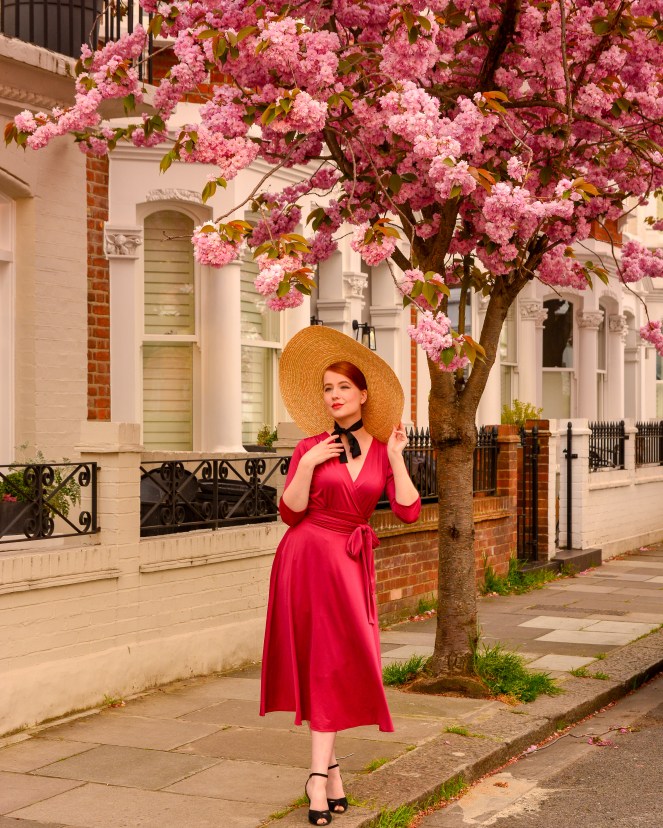 As you may know we recently went to New York, and while it’s always tough coming back from holiday it made it just a little bit easier when we arrived back in London to see it in bloom! We have a big tree outside our house, and after just two weeks away it transformed from having bare branches to being covered in big pink blossoms like magic – so beautiful! I’ve always wanted to shoot with blossom, and I knew that the Margaret dress in raspberry from Karina Dresses would go so well with it. While our tree bloomed too high up for photos we found some more in our neighbourhood that were just right. See more below!
