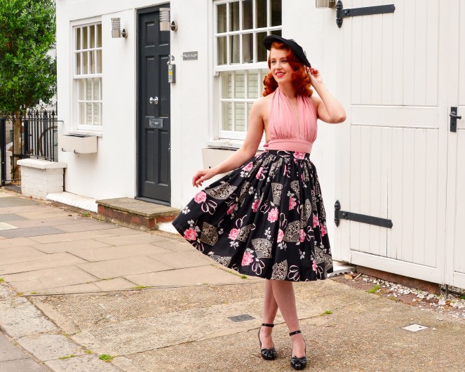 The Valentina boudoir set features a halter top and a 1950s style skirt. The skirt is gathered to give it the ultimate fullness, and is made in a 100% cotton novelty print fabric with roses and fans. The top is a Violets in May staple, this time coming in the softest baby pink which matches the roses in the skirt perfectly. It does up with hooks and eyes at the back, and it has a big detachable bow which is too cute! The top is backless, showing more skin than I would normally bare, but I still felt so comfortable in it. The Valentina set is truly so chic, and I added all-black accessories to heighten the glamour! Sizes available range from UK6-18, all handmade to order for delivery in 6-8 weeks.