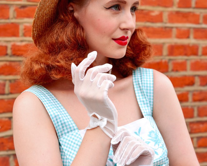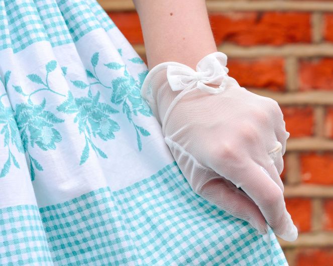 The India gloves are the sweetest wrist-length gloves made in an ivory fine net from St Gallen in Switzerland. These beauties immediately caught my eye as they’re particularly complementary to a vintage ensemble, and they’re so nice and light for the hot summer weather we’ve been having. Plus the bows at the wrists are delightful! Like all Cornelia James gloves these are made with such high attention to detail and care – did you know that 8 foot of stitching goes into each pair of gloves? They also come in a very luxurious pale green box with a pink ribbon, perfect for storage or a gift.