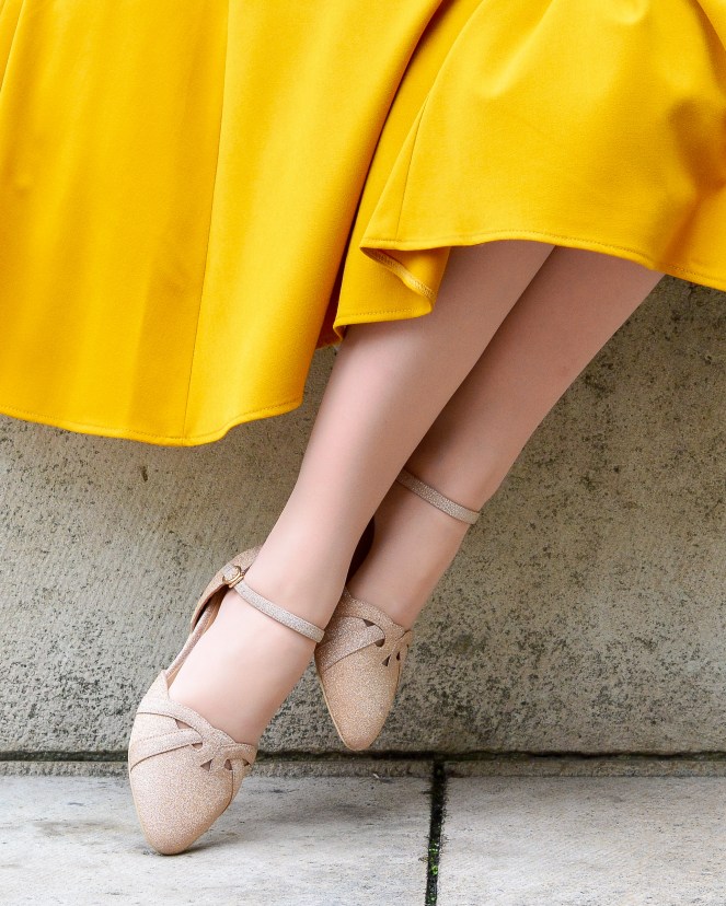 Taking inspiration from possibly the most iconic 20s book, the Great Gatsby, Sam has crafted a mini-collection of three styles where one is not complete without the others. Each colourway of the Manhattan style features part of the quote “…among the whisperings & the champagne & the stars.” Available in Midnight (black), Champagne (gold), and Solitaire (silver), each pair is covered in the finest coarse glitter from Korea. Let me tell you, this glitter is amazing! You might expect it to flake off but it absolutely doesn’t, and oh does it sparkle! I was almost blinded by these beauties when I pulled them out of the box, they are so wonderfully dazzling. They feature some art deco-style detailing both at the pointed toe and the heel, and fasten with a quick release buckle that prevents wear on the strap. I can also attest to the comfort of these beauties – I walked nearly 9km round Brussels in them and there was nary a blister in sight by the end of the day! I’m wearing my usual size 37 and that’s the perfect fit for me.