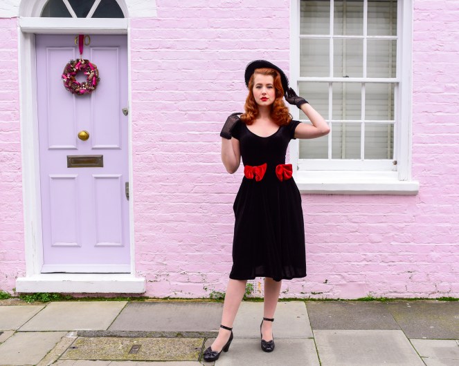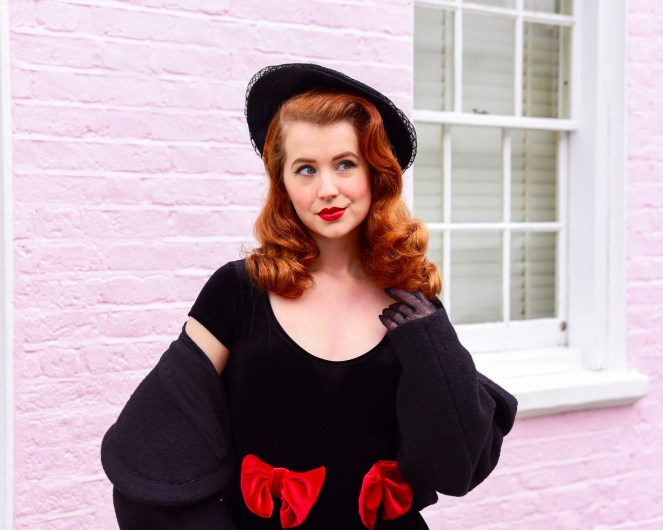 As someone who loves being comfy but also overdressed (it’s a given when you dress 50s, am I right?) the Norma dress ticks all the boxes. Made of the softest stretch velvet, it’s an absolute dream to wear – looking glam has never been so easy! I chose the black version which has adorable giant red bows sewn at the waist, and it also comes in red and princess blue versions which are equally gorgeous. And I’m sure you’ll be as pleased as I am to know it has pockets! I’m wearing a size XS, which is best for a 32/34″ bust and a 24/25″ waist. I love that the stretch fabric leaves room for food, and that the sizing is for every body, going up to 3X covering a 45/48″ bust and a 38/41″ waist. The Norma dress is also currently on sale (whoop!), down to $75USD!