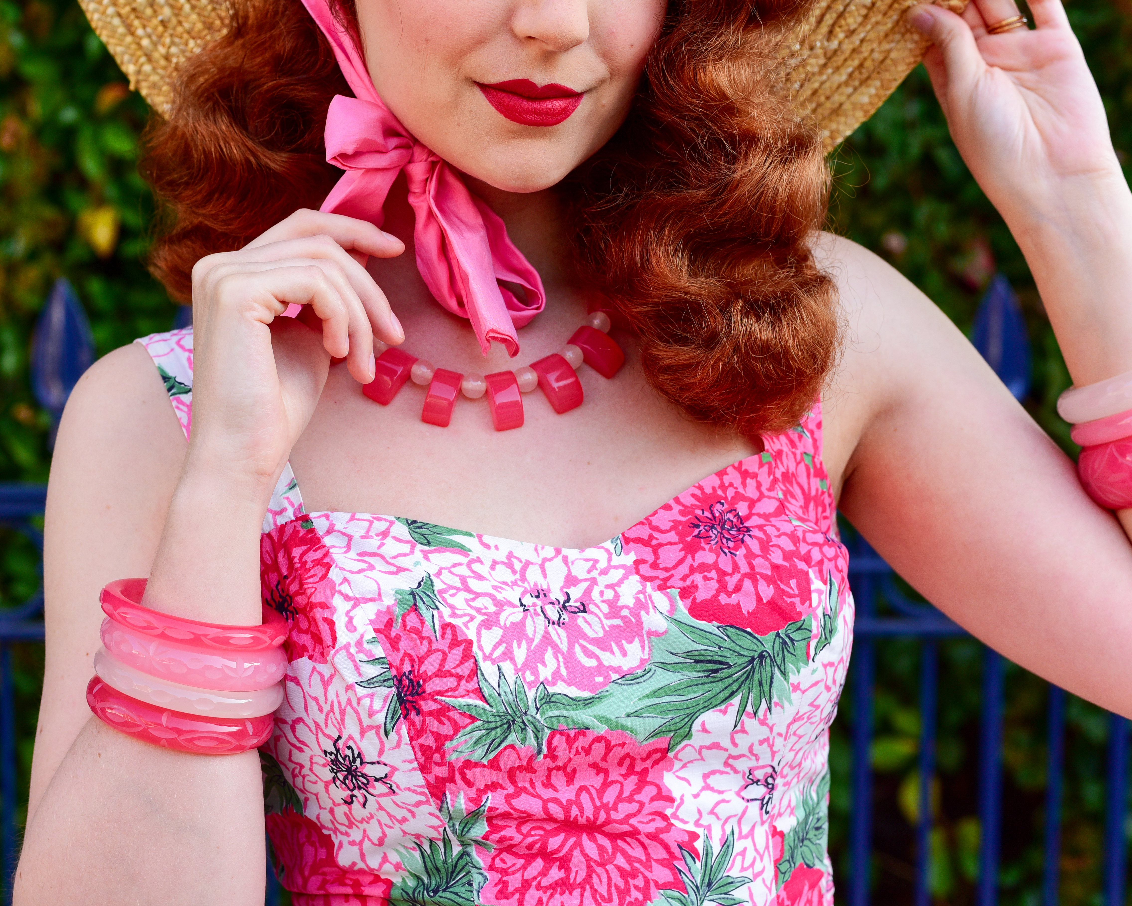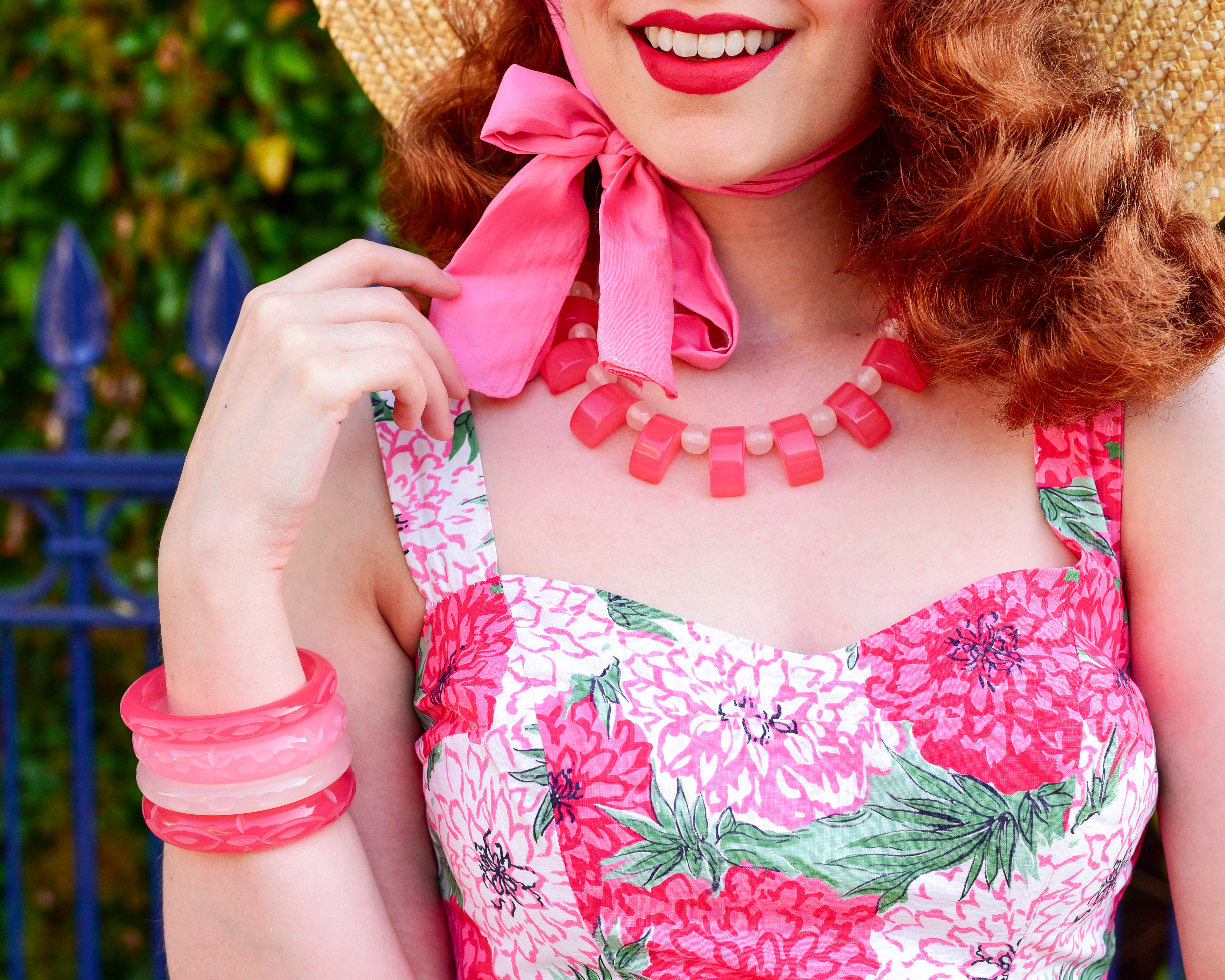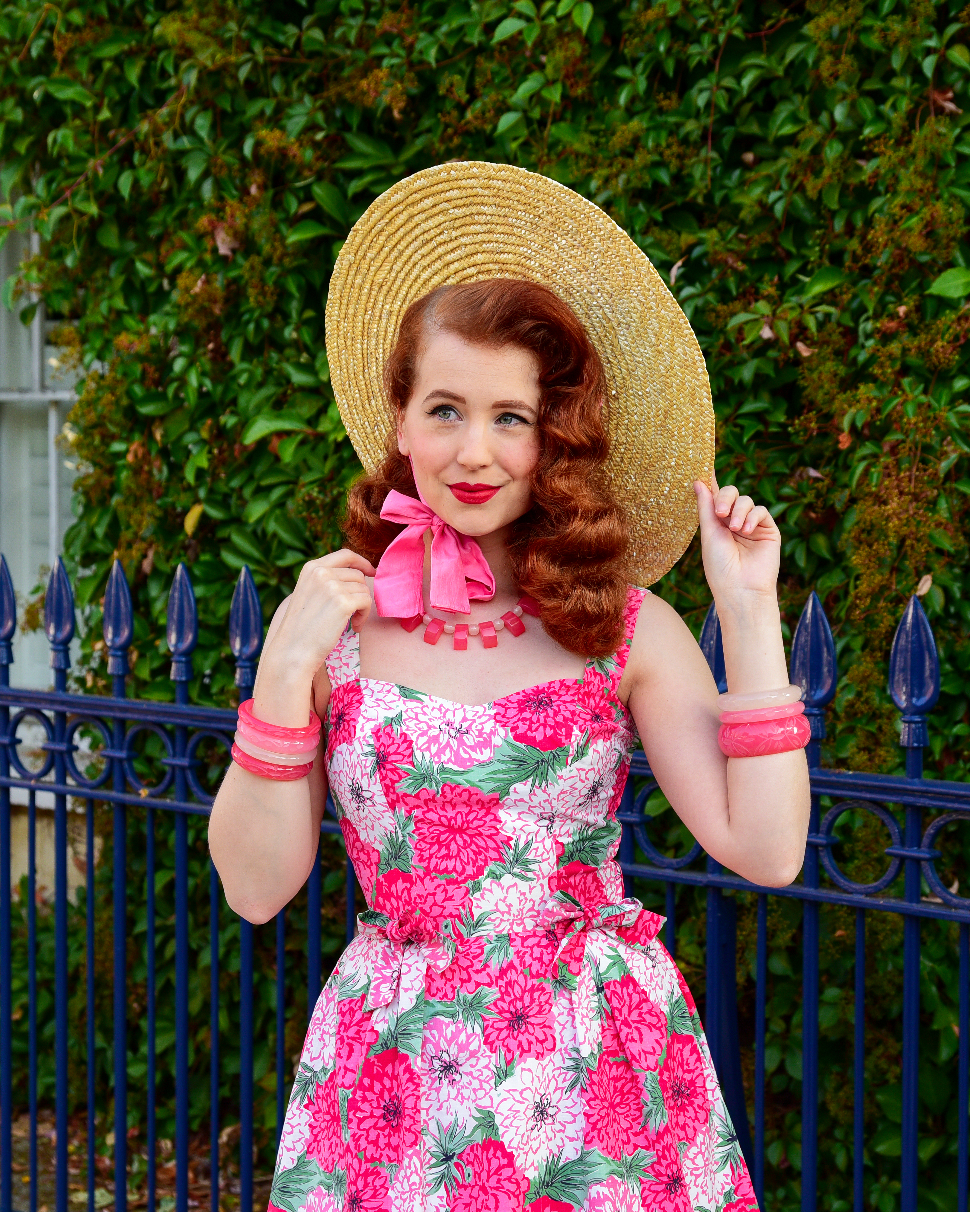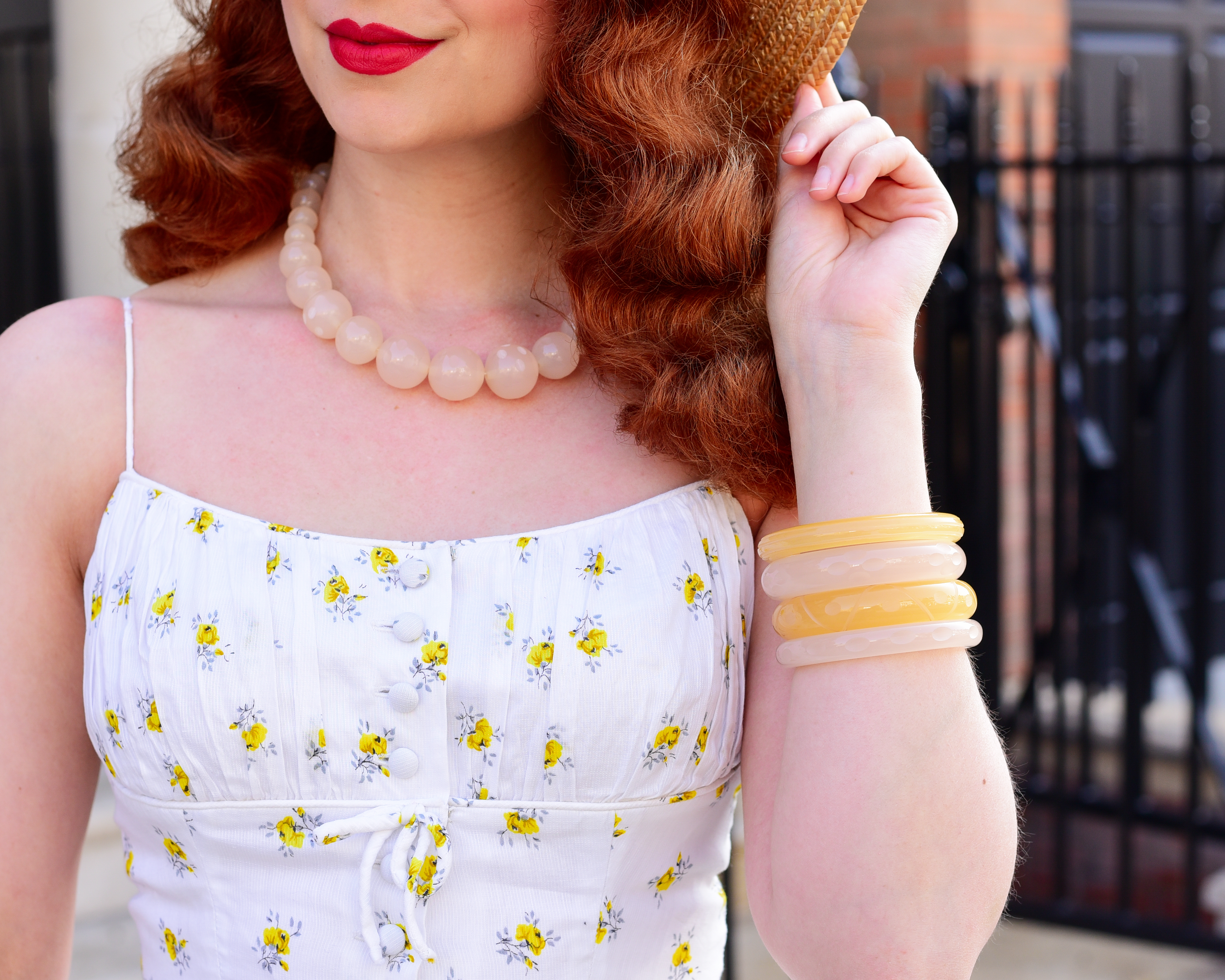 For my first outfit I’m wearing narrow and midi coconut Maiden fit bangles, narrow and midi rose Maiden fit bangles, narrow and midi bon bon Maiden fit bangles, a classic fit wide rose bangle, and the rose beaded necklace. I love how the colour combo was such a good match with my vintage Horrockses dress!